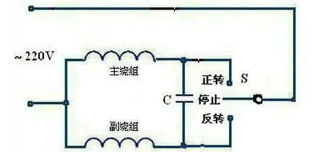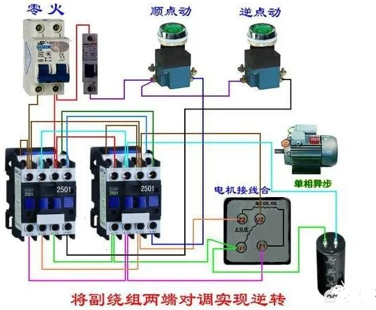 這是最簡單的單相電正反轉控制電路,通過切換主副繞組實現正反轉。這是通電就轉動的接線圖,如果要實現點動開關,我們可以采用兩個交流接觸器來實現,如下圖